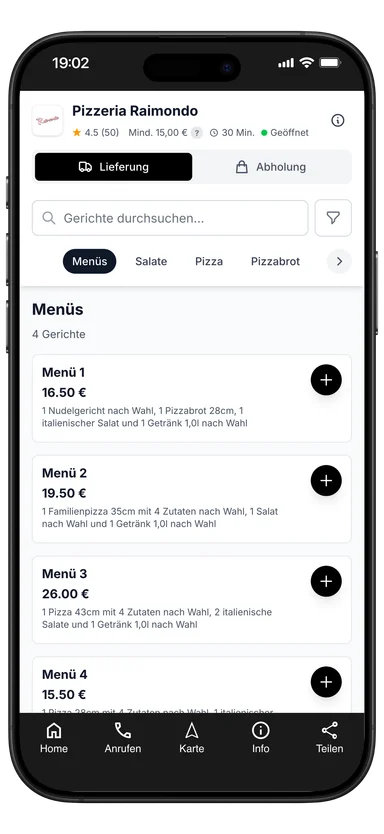1 Nudelgericht nach Wahl, 1 Pizzabrot 28cm, 1 italienischer Salat und 1 Getränk 1,0l nach Wahl